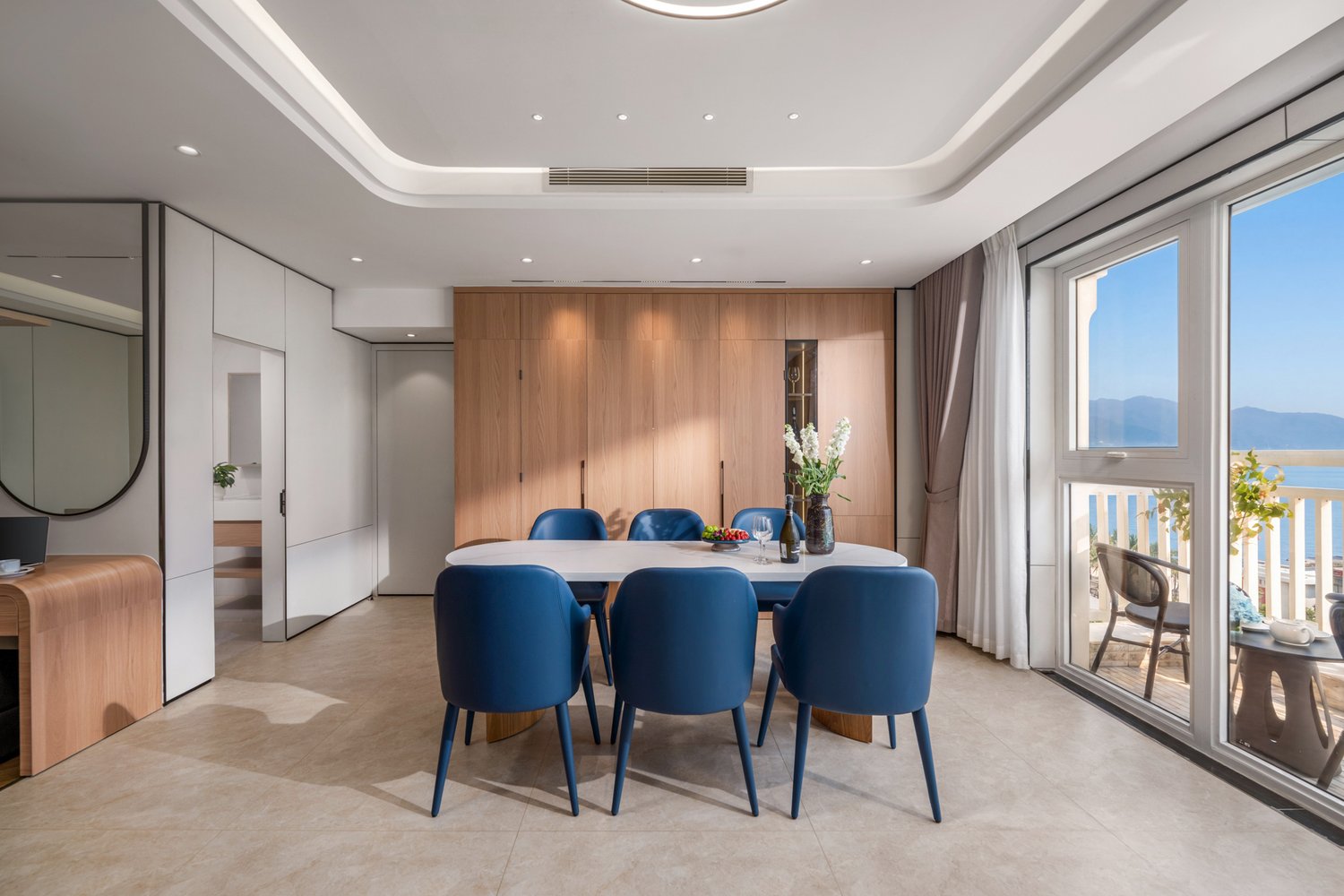 Điểm ấn tượng nhất của căn phòng là thiết kế không gian mở (open-plan) kết nối khéo léo giữa khu vực tiếp khách, bàn ăn và nhà bếp. Sự kết hợp giữa tông màu trắng chủ đạo, gỗ ấm áp và những điểm nhấn màu xanh dương từ đồ nội thất tạo nên một bảng màu thanh lịch, gợi nhắc đến bãi biển xanh trong ngay bên ngoài cửa sổ. Các đường cong kiến trúc trên trần nhà giúp không gian trở nên mềm mại và cuốn hút hơn.