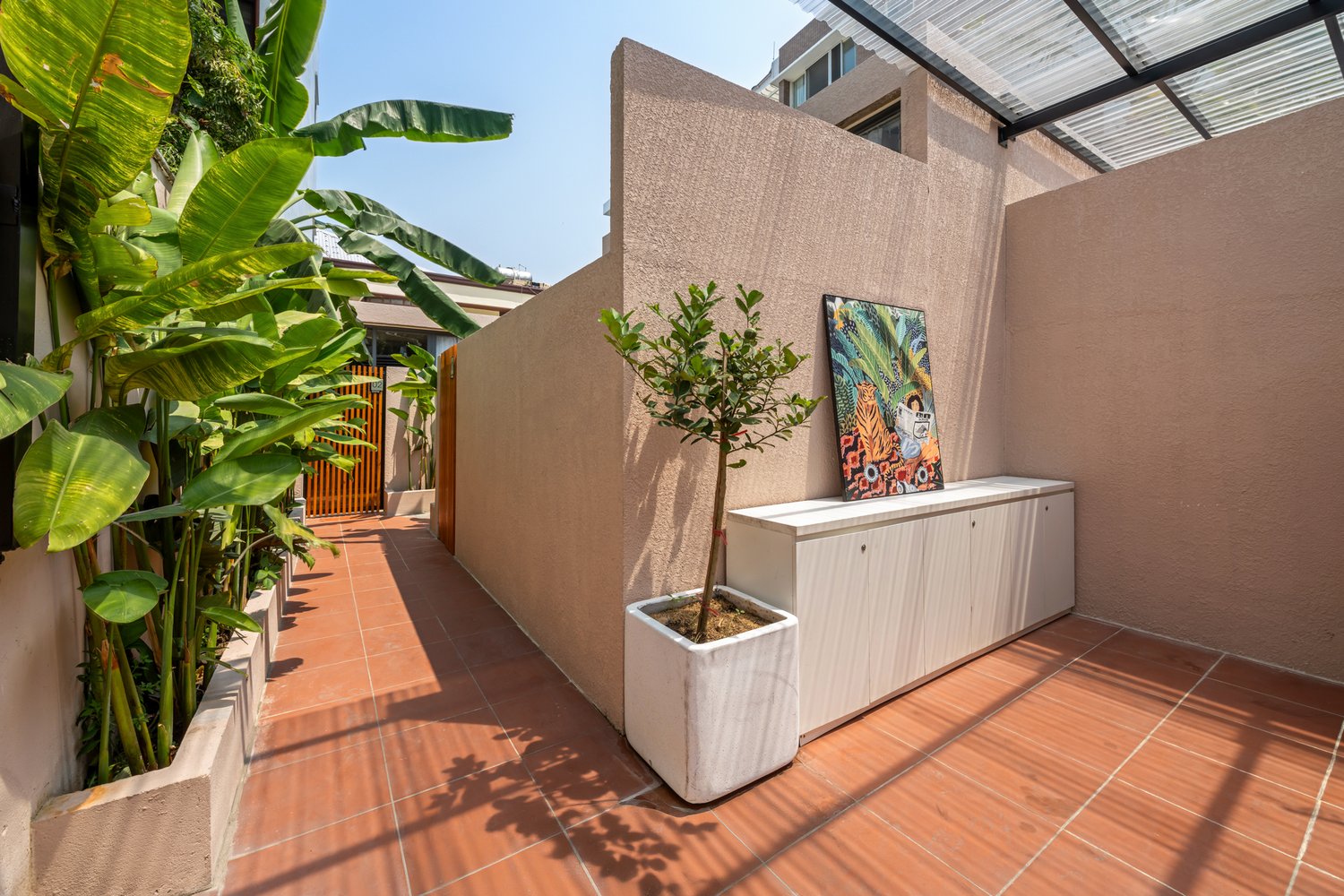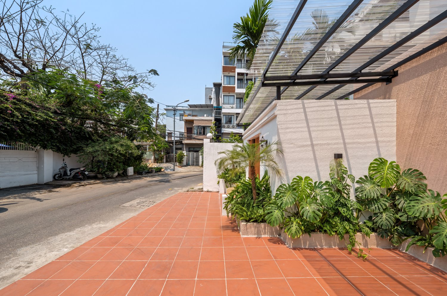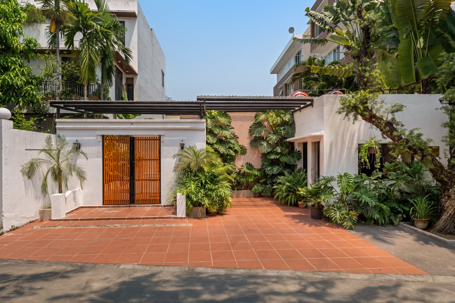 Hệ thống cây xanh nhiệt đới được bố trí chiến lược: hàng chuối cao vút dọc lối đi tạo bóng mát tự nhiên, monstera xanh mướt ôm quanh bồn trồng bê tông trắng, và những cây cọ nhỏ đặt trước cổng gỗ lam tạo điểm nhấn xanh cho mặt tiền.