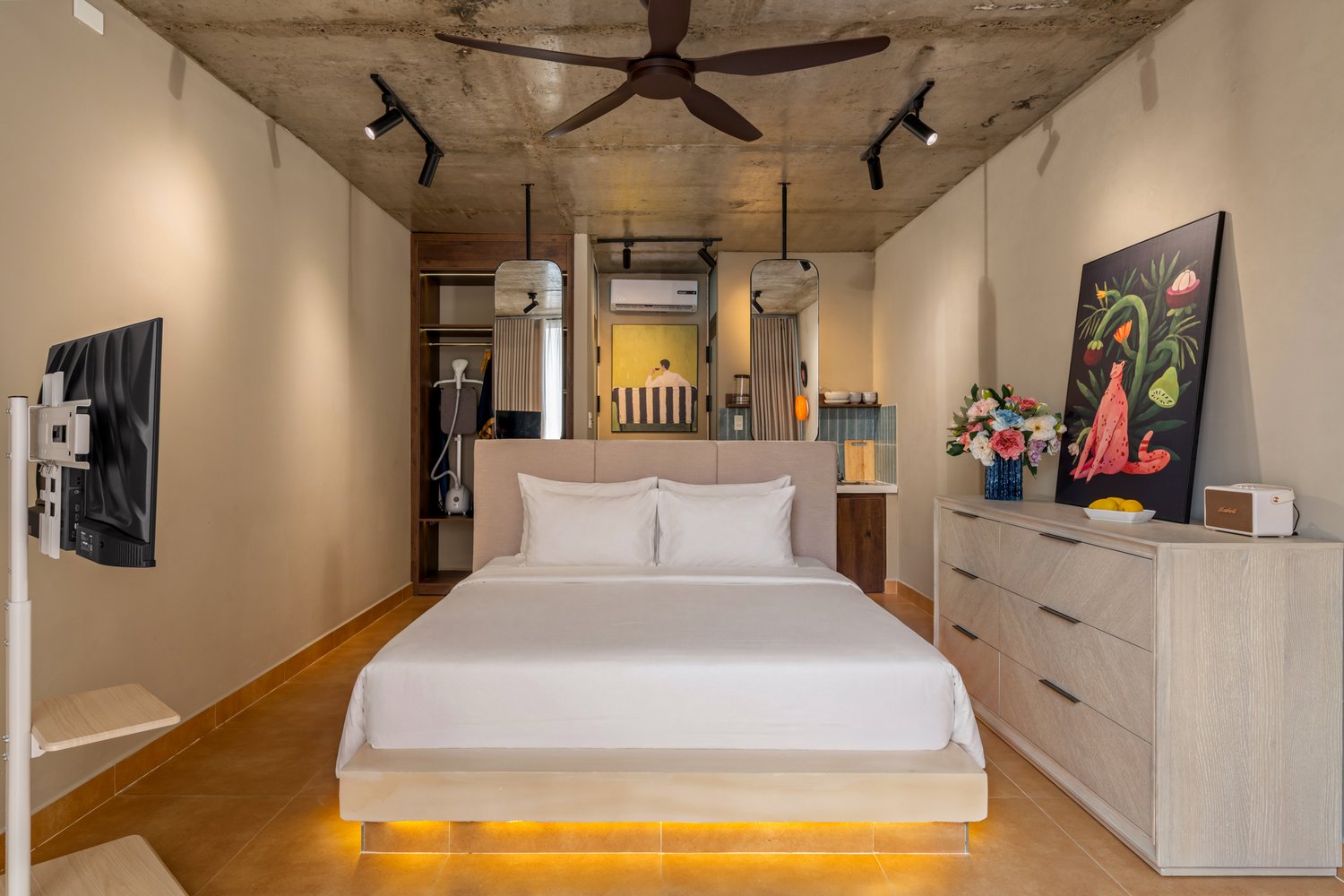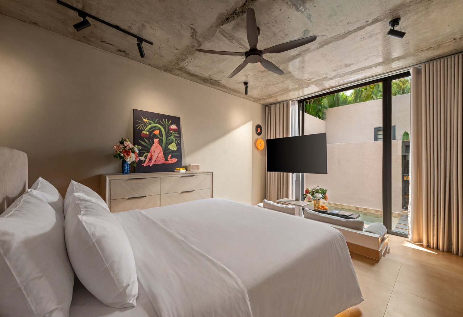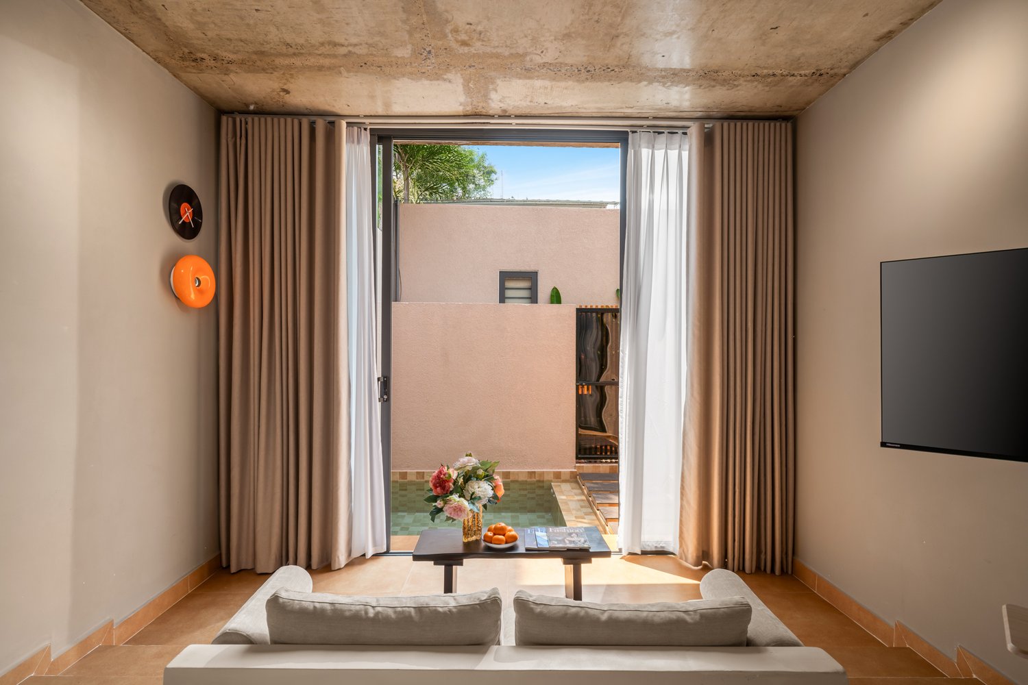Mỗi phòng đều sở hữu một hồ bơi nhỏ riêng tư, lát gạch mosaic xanh ngọc tuyệt đẹp. Khoảng sân nửa trong nửa ngoài kết nối phòng ngủ với hồ bơi qua cửa kính trượt toàn phần — xóa nhòa ranh giới giữa không gian sống và thiên nhiên.