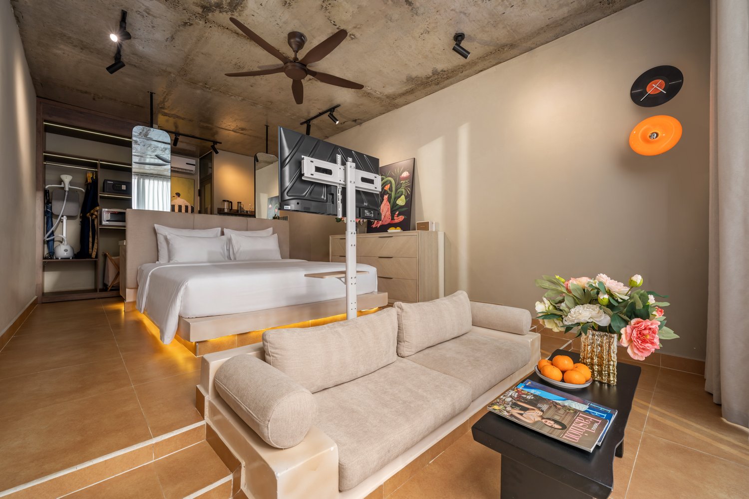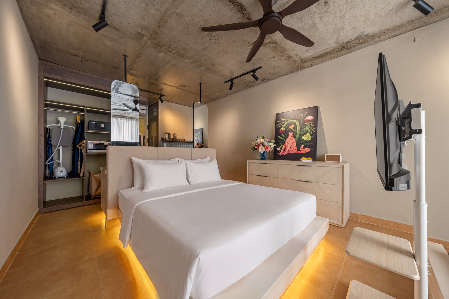 Đường viền LED amber dưới chân giường tạo hiệu ứng “floating bed” — chiếc giường như lơ lửng trong không gian, mang đến cảm giác vừa hiện đại vừa huyền ảo. Tủ gỗ với vân chevron herringbone, tranh pop-art rực rỡ hình báo hồng và đồng hồ vinyl retro treo tường — tất cả cùng kể câu chuyện về sự giao thoa giữa nghệ thuật đương đại và phong cách vintage.