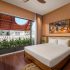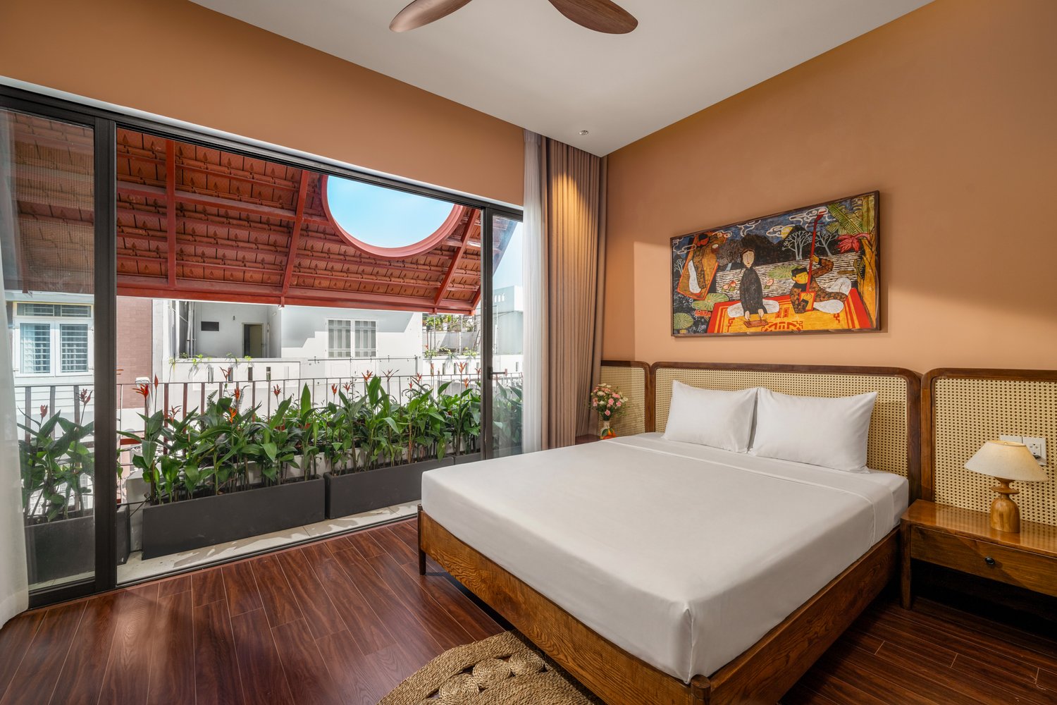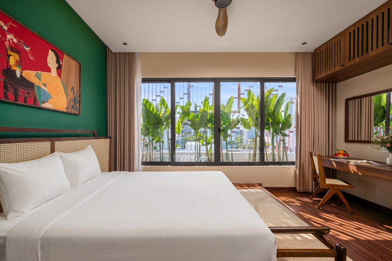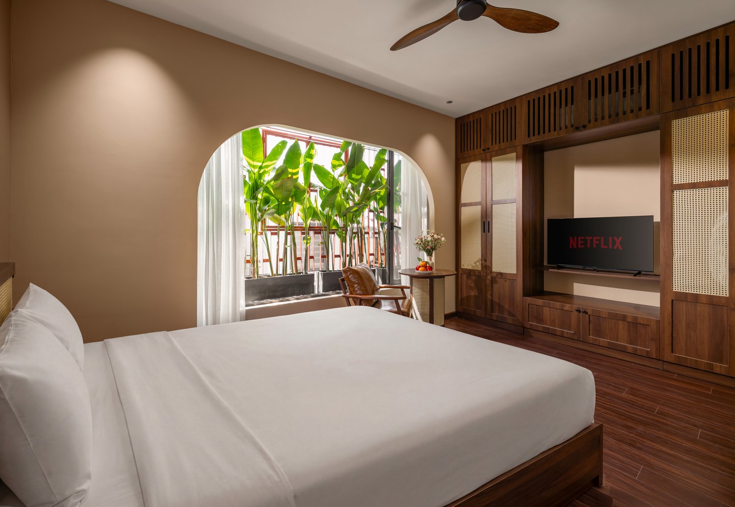 Điểm nhấn đầu tiên khi bước vào không gian này chính là những hệ cửa vòm rộng mở. Không chỉ là lối dẫn sáng, chúng còn là những ‘khung tranh’ sống động bao bọc lấy mảng xanh nhiệt đới bên ngoài. Góc nhìn từ giường ngủ ra vườn chuối xanh mướt tạo nên một cảm giác thư thái tuyệt đối.