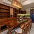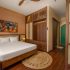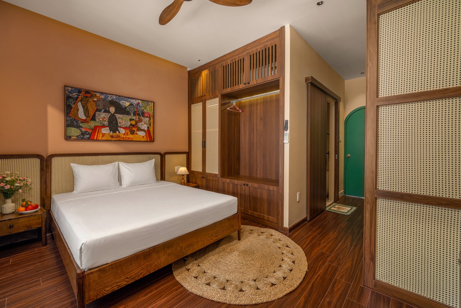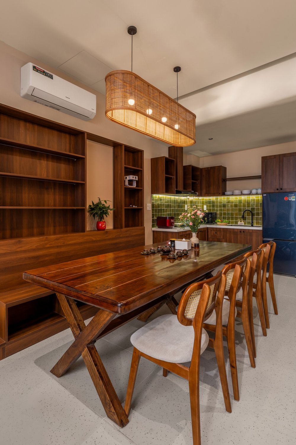Sự kết hợp giữa gỗ tông trầm, mây tre đan và màu sơn earthy tạo nên một tổng thể ấm cúng nhưng không kém phần sang trọng. Ánh sáng vàng được bố trí tinh tế để làm nổi bật các bề mặt chất liệu, tạo nên chiều sâu cho bức ảnh.