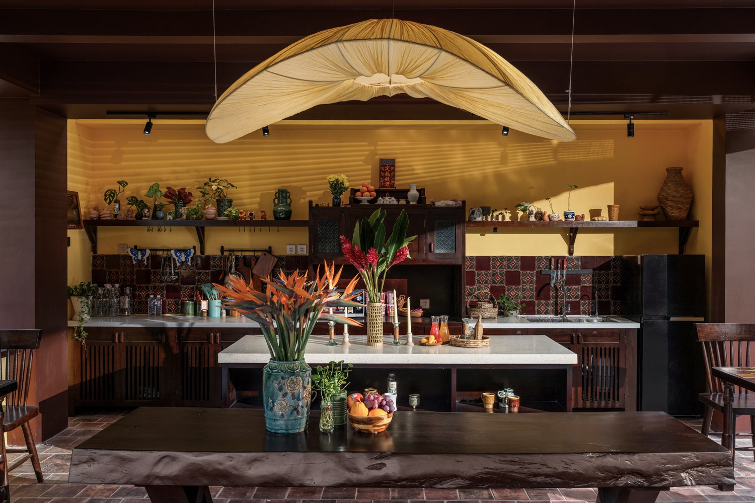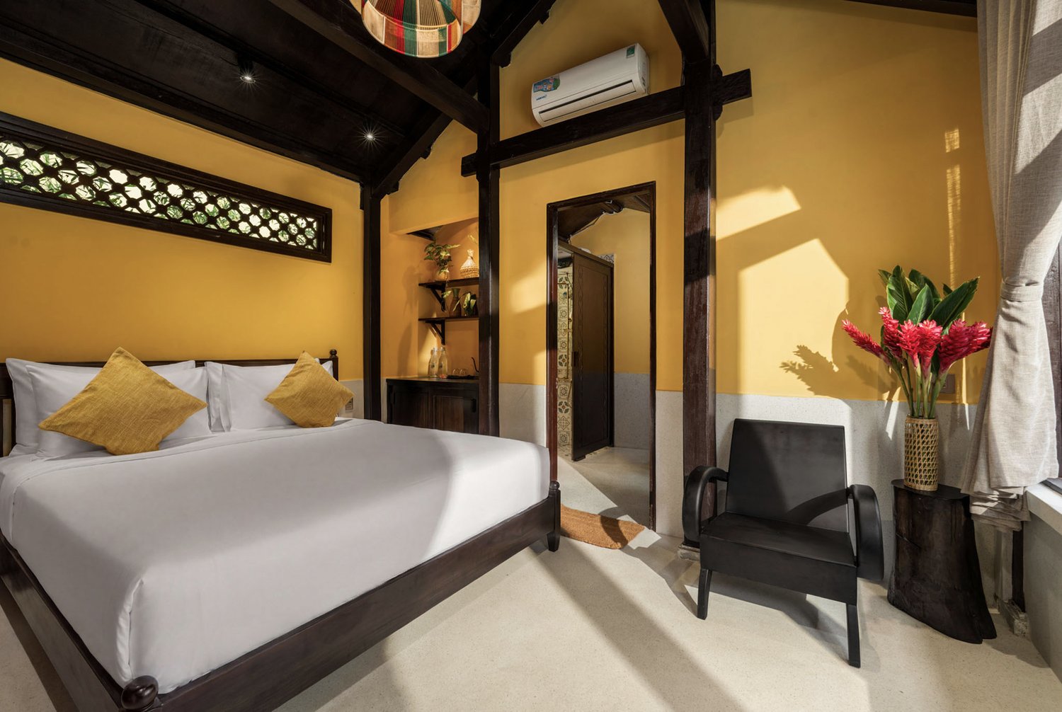 Entering DeMin Villa, the first feeling is warmth and intimacy. The vibrant yellow walls under the Central sun are balanced by the somber black tones of the pillar system and wooden furniture. The architects skillfully integrated traditional details such as cement tiles, louvered doors, and hand-carved patterns, creating a space full of narrative.