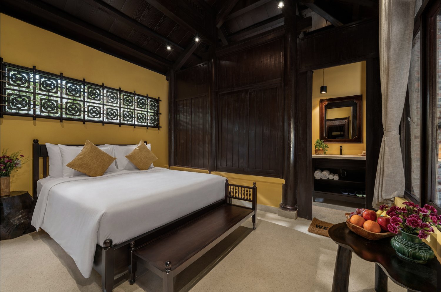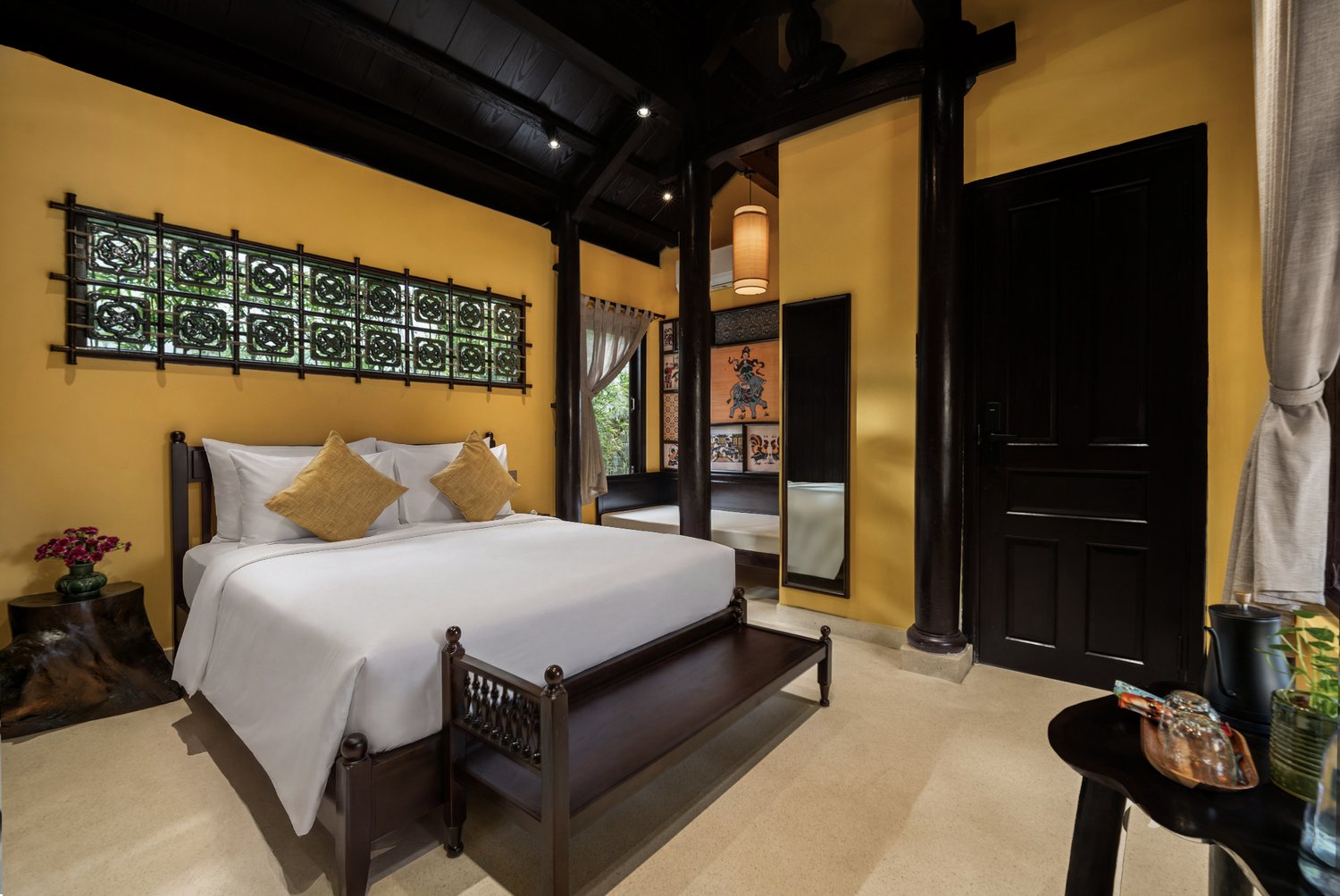Bước vào DeMin Villa, cảm giác đầu tiên là sự ấm cúng và gần gũi. Những mảng tường vàng rực rỡ dưới ánh nắng miền Trung được cân bằng lại bởi tông đen trầm mặc của hệ thống cột kèo và nội thất gỗ. Các kiến trúc sư đã khéo léo lồng ghép những chi tiết truyền thống như gạch bông, cửa lá sách và những hoa văn chạm trổ thủ công, tạo nên một không gian đầy tính tự sự.