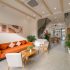 The living room is designed in an open-plan style, where a modern orange sofa emerges as a strong and energetic focal point. The contrast between the burning orange and the cold, luxurious look of white marble floors creates an irresistible attraction. The staircase system with slender black iron lines is not just a path for movement but also a sculpture in space.