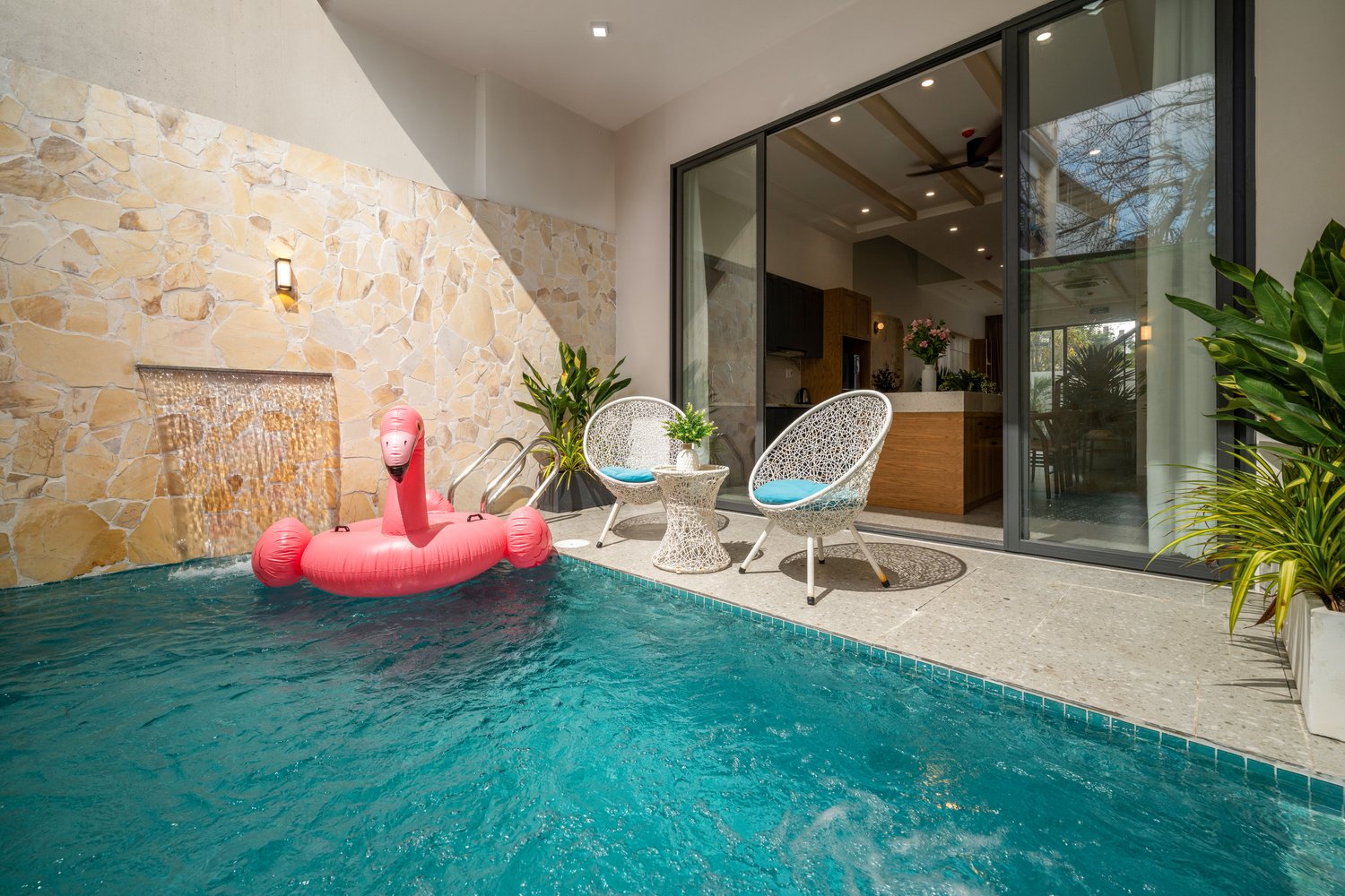 Đi sâu vào bên trong, trái tim của ngôi nhà là một khu vực plunge pool thu nhỏ. Thay vì những hồ bơi vuông vức thông thường, vách đá tự nhiên với dòng thác chảy róc rách mang lại một trải nghiệm giác quan hoàn chỉnh. Tiếng nước, màu xanh của cây lá và ánh nắng xuyên qua khe mái tạo nên một bầu không khí thư thái tuyệt đối, được chúng tôi ghi lại trọn vẹn trong từng khung hình portfolio.