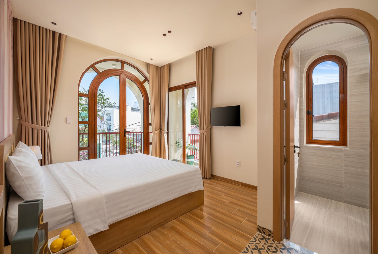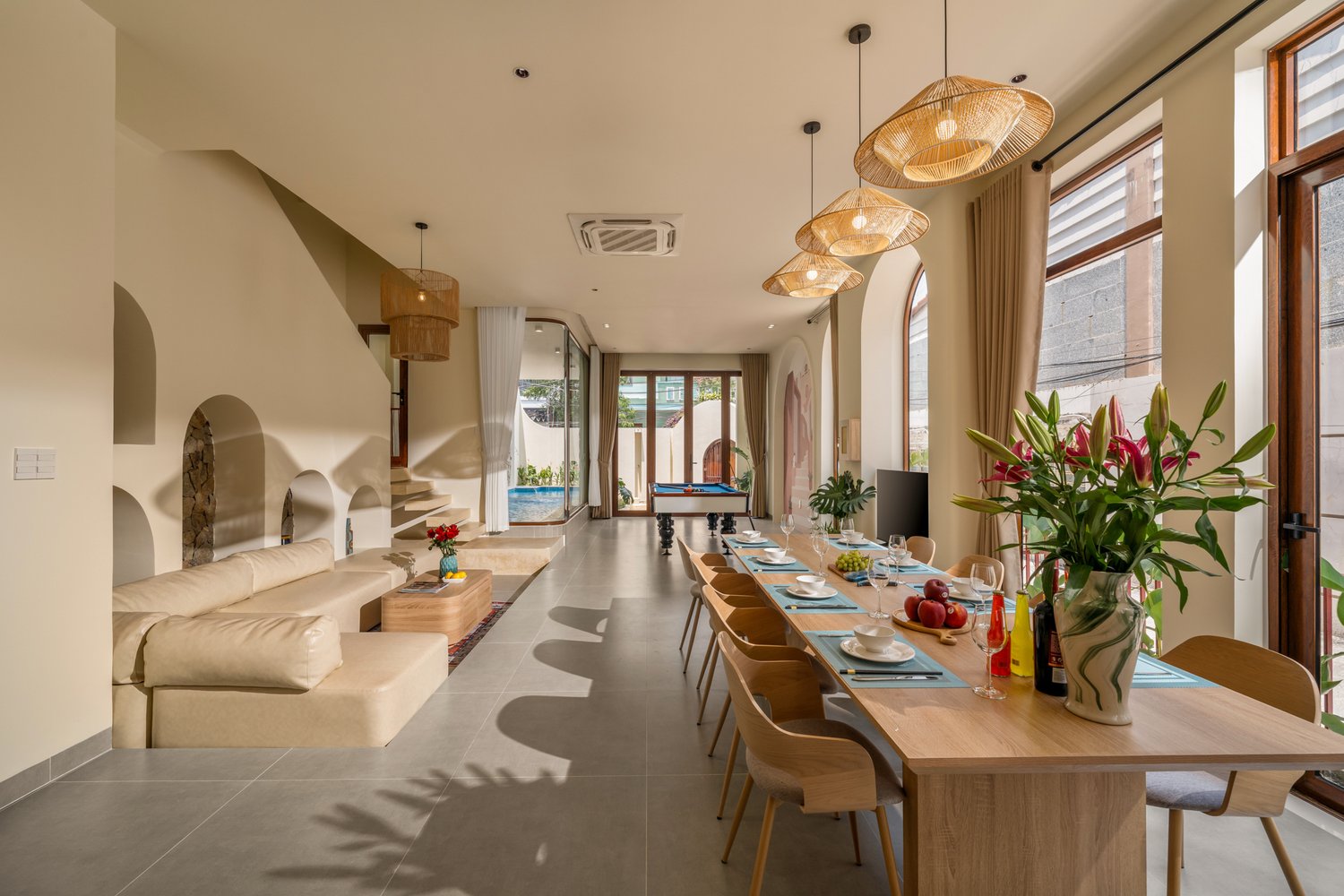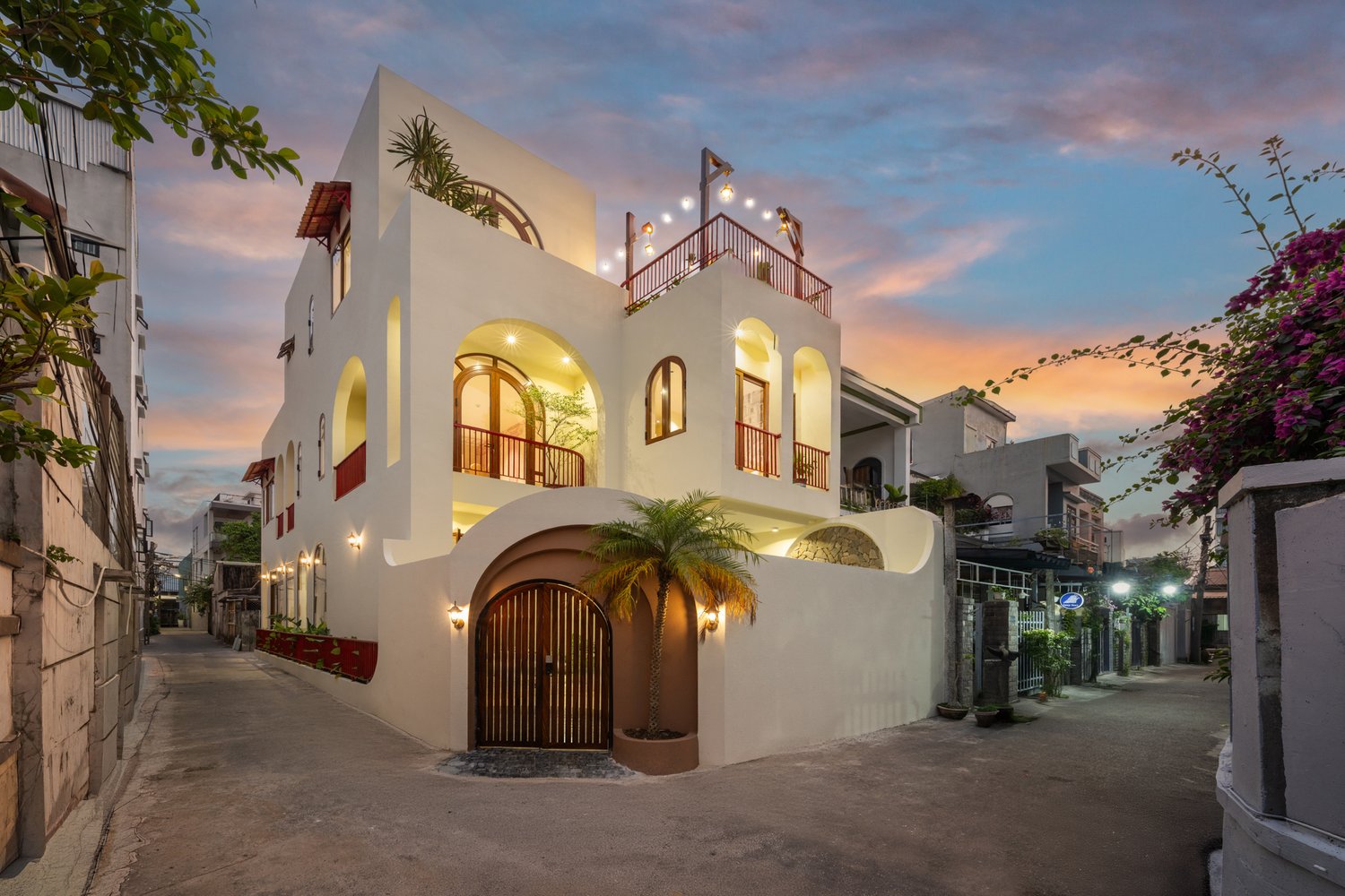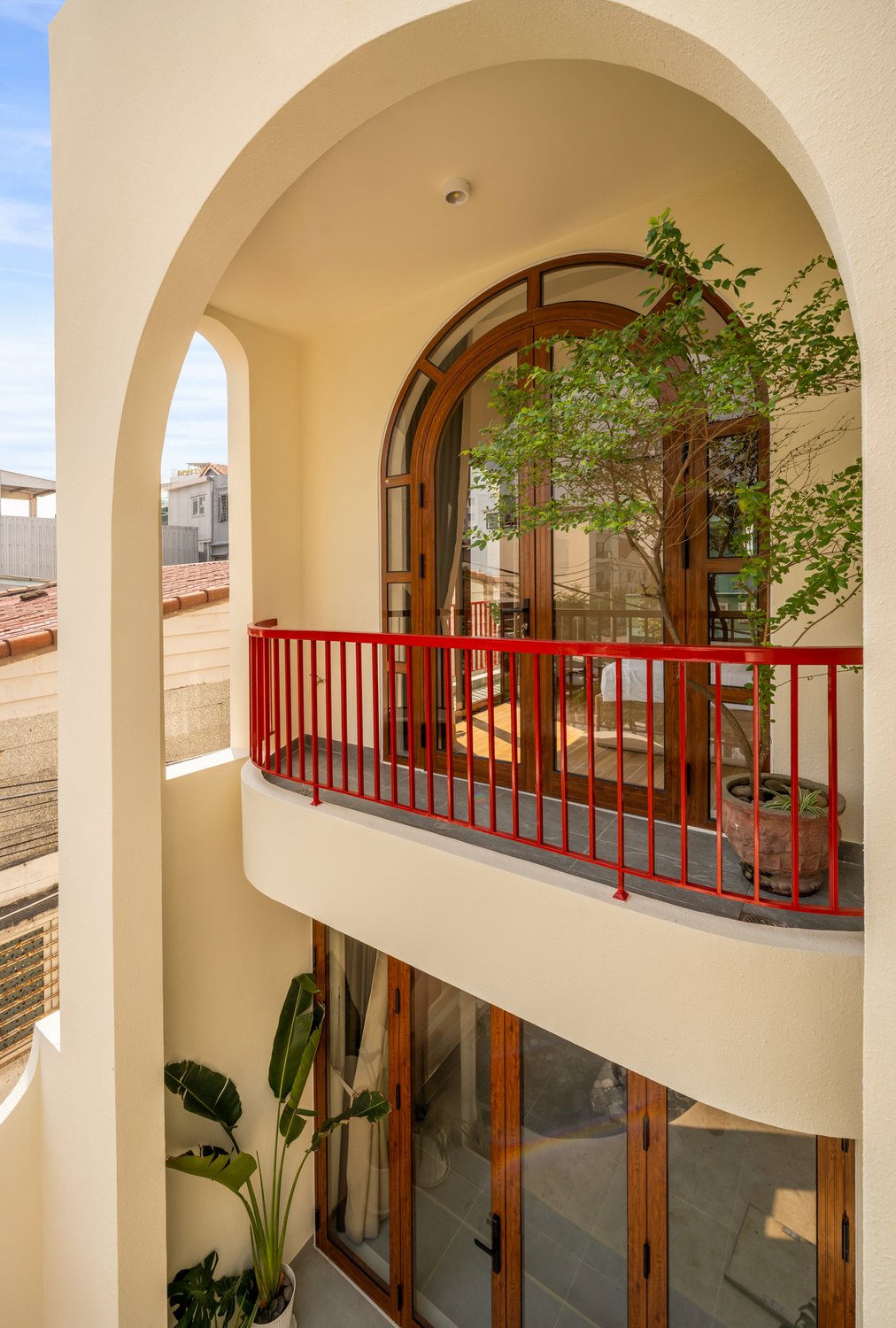 Trong nhiếp ảnh kiến trúc, ánh sáng và hình khối luôn là hai yếu tố quyết định linh hồn của tác phẩm. Với dự án **The Arched House**, Ha Phong Studio đã được truyền cảm hứng mạnh mẽ bởi những đường cong vòm mềm mại – một biểu tượng của sự tự do và sang trọng trong phong cách Địa Trung Hải. Công trình tọa lạc trong một con hẻm nhỏ, nhưng sự hiện diện của nó lại vô cùng nổi bật nhờ sự tối giản đầy tinh tế. Tone màu kem chủ đạo không chỉ giúp ngôi nhà trông rộng rãi hơn mà còn tạo ra một phông nền hoàn hảo để ánh sáng hoàng hôn có thể “nhảy múa” trên những mảng tường. Việc tích hợp một hồ bơi nhỏ ngay tại tầng trệt là một giải pháp kiến trúc thông minh, biến nơi đây thành một ốc đảo tách biệt hoàn toàn với sự ồn ào bên ngoài.The Arched House: A Mediterranean Symphony in the Heart of the City