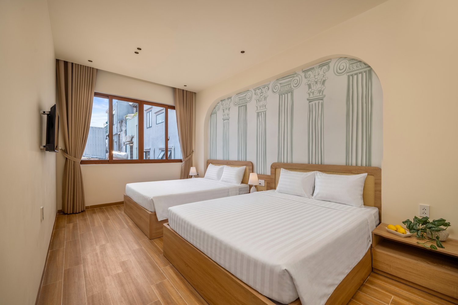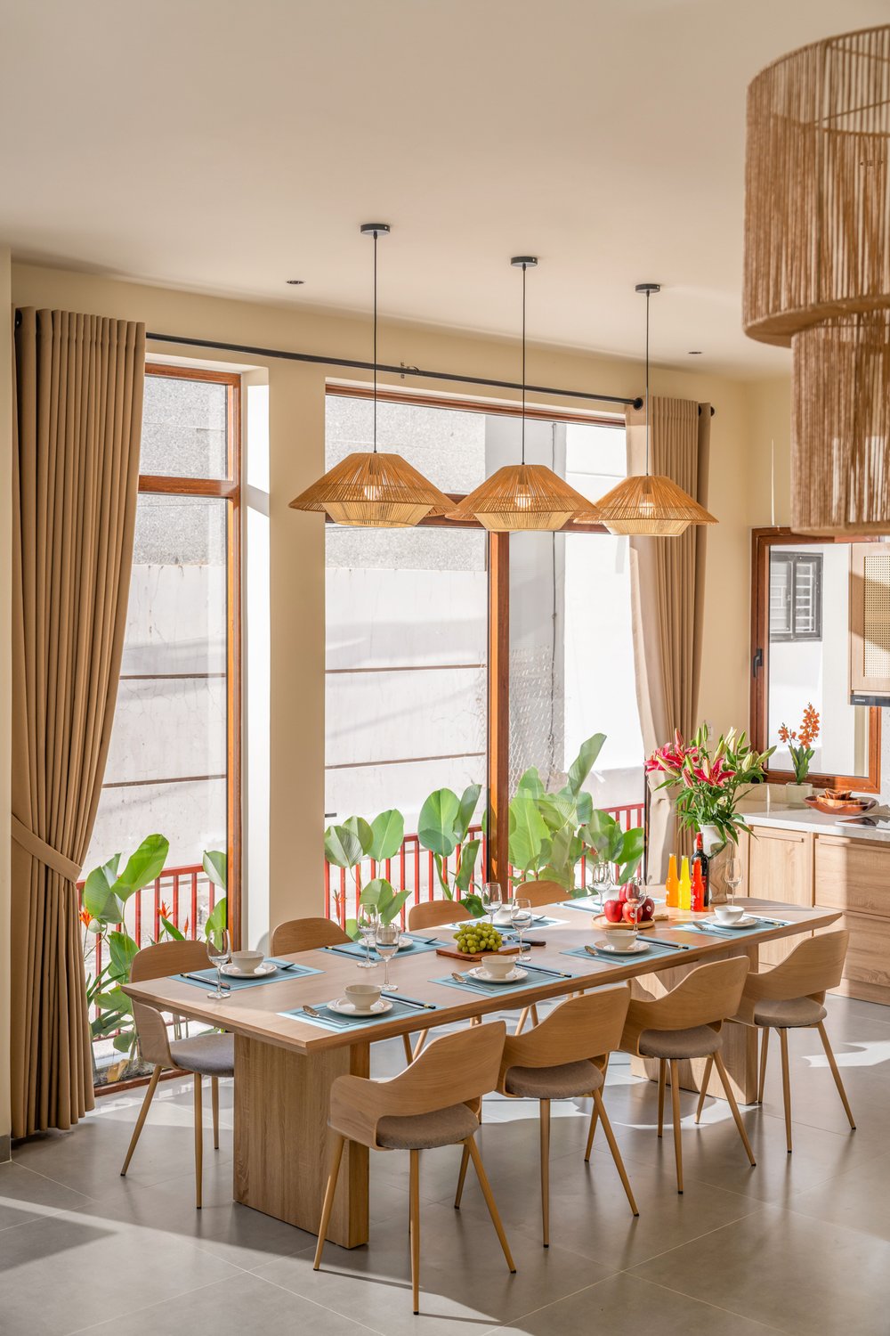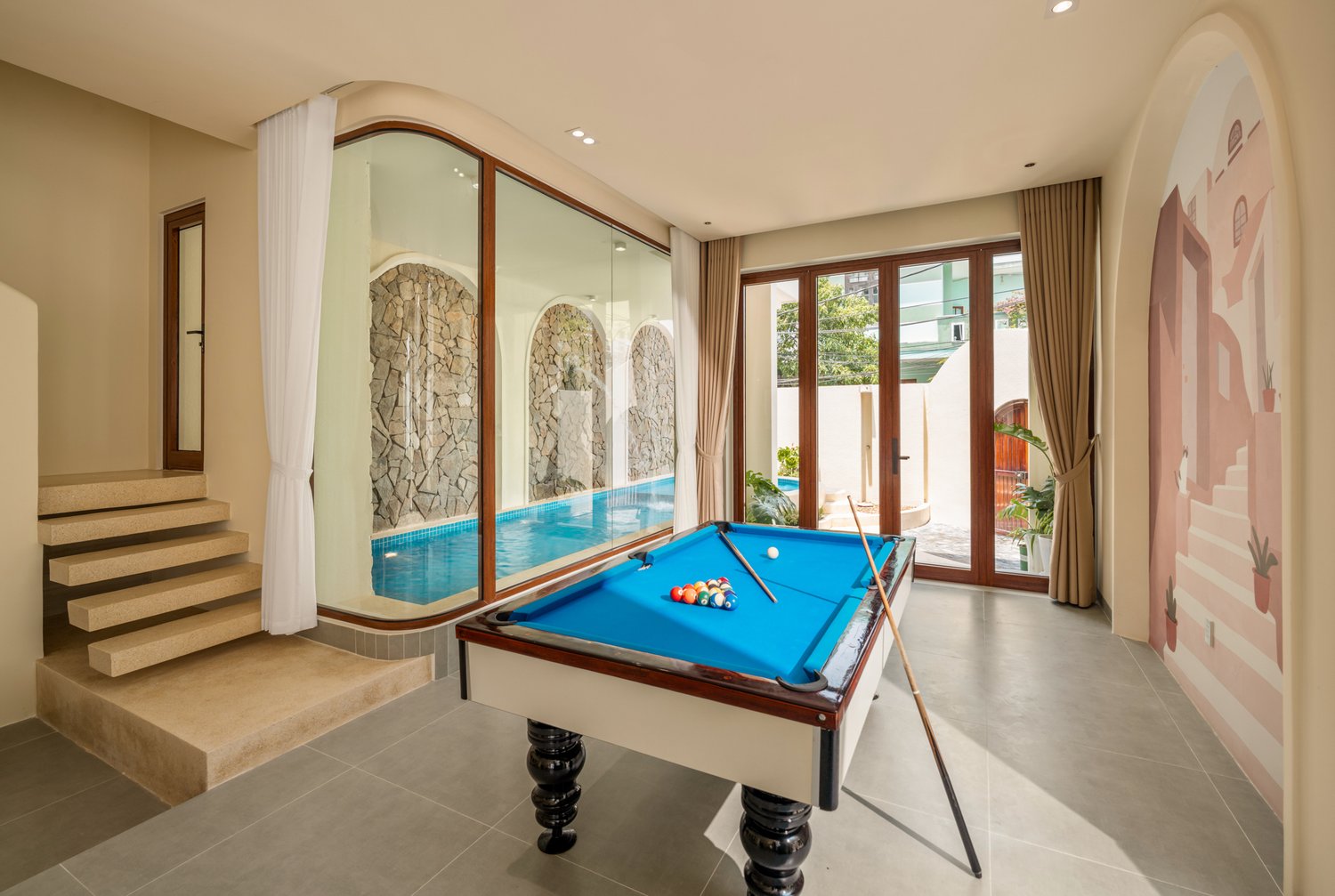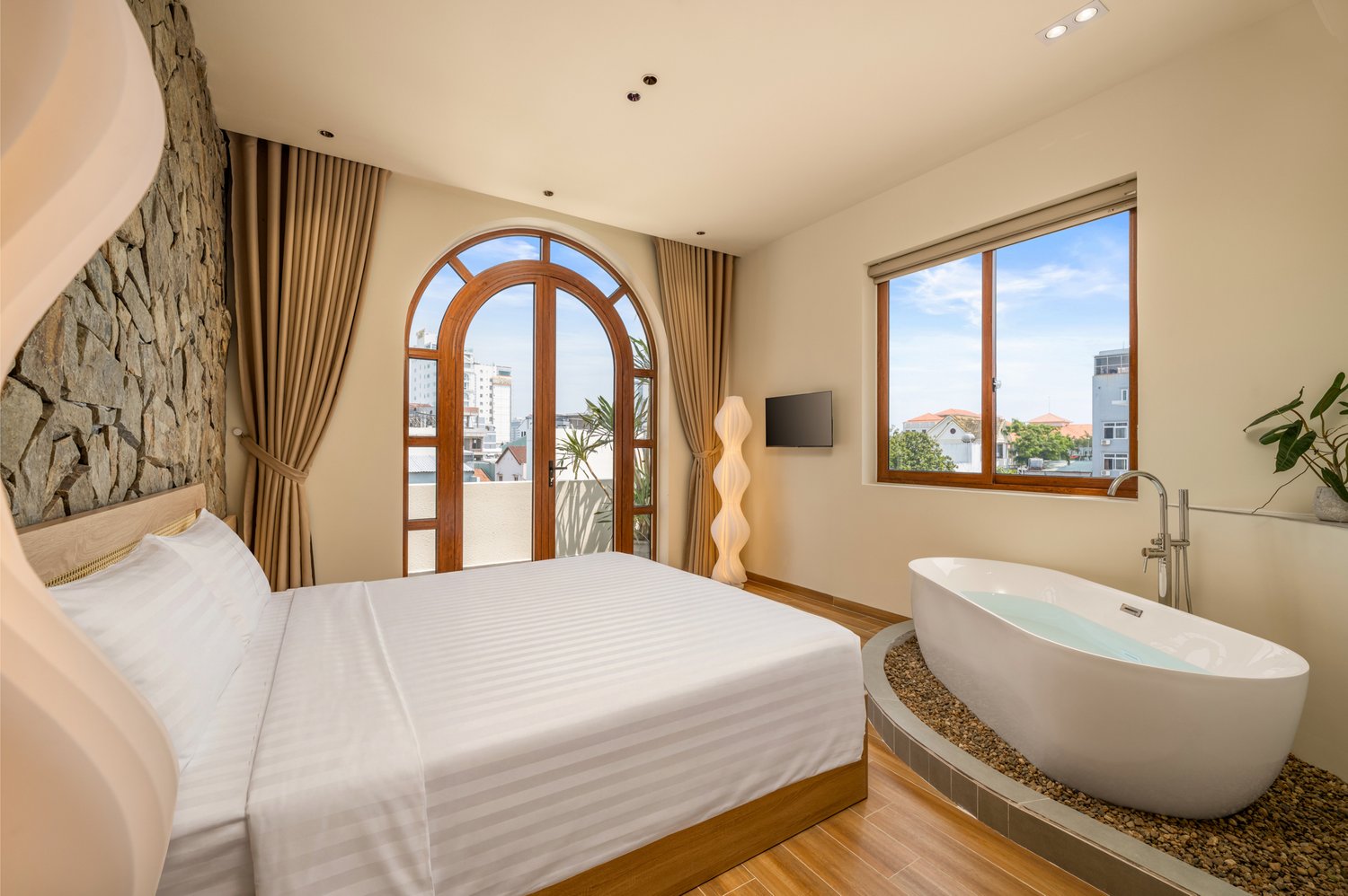 Trong nhiếp ảnh kiến trúc, ánh sáng và hình khối luôn là hai yếu tố quyết định linh hồn của tác phẩm. Với dự án **The Arched House**, Ha Phong Studio đã được truyền cảm hứng mạnh mẽ bởi những đường cong vòm mềm mại – một biểu tượng của sự tự do và sang trọng trong phong cách Địa Trung Hải. Công trình tọa lạc trong một con hẻm nhỏ, nhưng sự hiện diện của nó lại vô cùng nổi bật nhờ sự tối giản đầy tinh tế. Tone màu kem chủ đạo không chỉ giúp ngôi nhà trông rộng rãi hơn mà còn tạo ra một phông nền hoàn hảo để ánh sáng hoàng hôn có thể “nhảy múa” trên những mảng tường. Việc tích hợp một hồ bơi nhỏ ngay tại tầng trệt là một giải pháp kiến trúc thông minh, biến nơi đây thành một ốc đảo tách biệt hoàn toàn với sự ồn ào bên ngoài.The Arched House: A Mediterranean Symphony in the Heart of the City